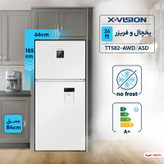 یخچال فریزر 26 فوت ایکس ویژن مدل TT582-AWD/AS ، دارای آبسردکن و یخساز نیمه اتوماتیک، با ارتفاع 185، پهنای 66 و عمق 84 سانتی متر، میزان مصرف انرژی A+، دارای 4 طبقه در یخچال و 2 طبقه در فریزر