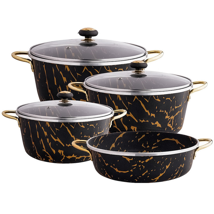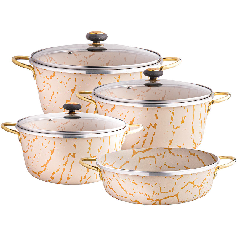 سرویس ۷ پارچه مدل گلدانی ماربل سورنا شامل سه عدد قابلمه در سایز های ۲۰ و ۲۴ و ۲۸ همراه با درب و یک عدد تابه در سایز ۲۸ می باشد . پوشش داخلی و بیرونی محصول از جنس گرانیت سه لایه و جنس دسته فلزی می باشد و از مرغوب ترین مواد اولیه تهیه شده است